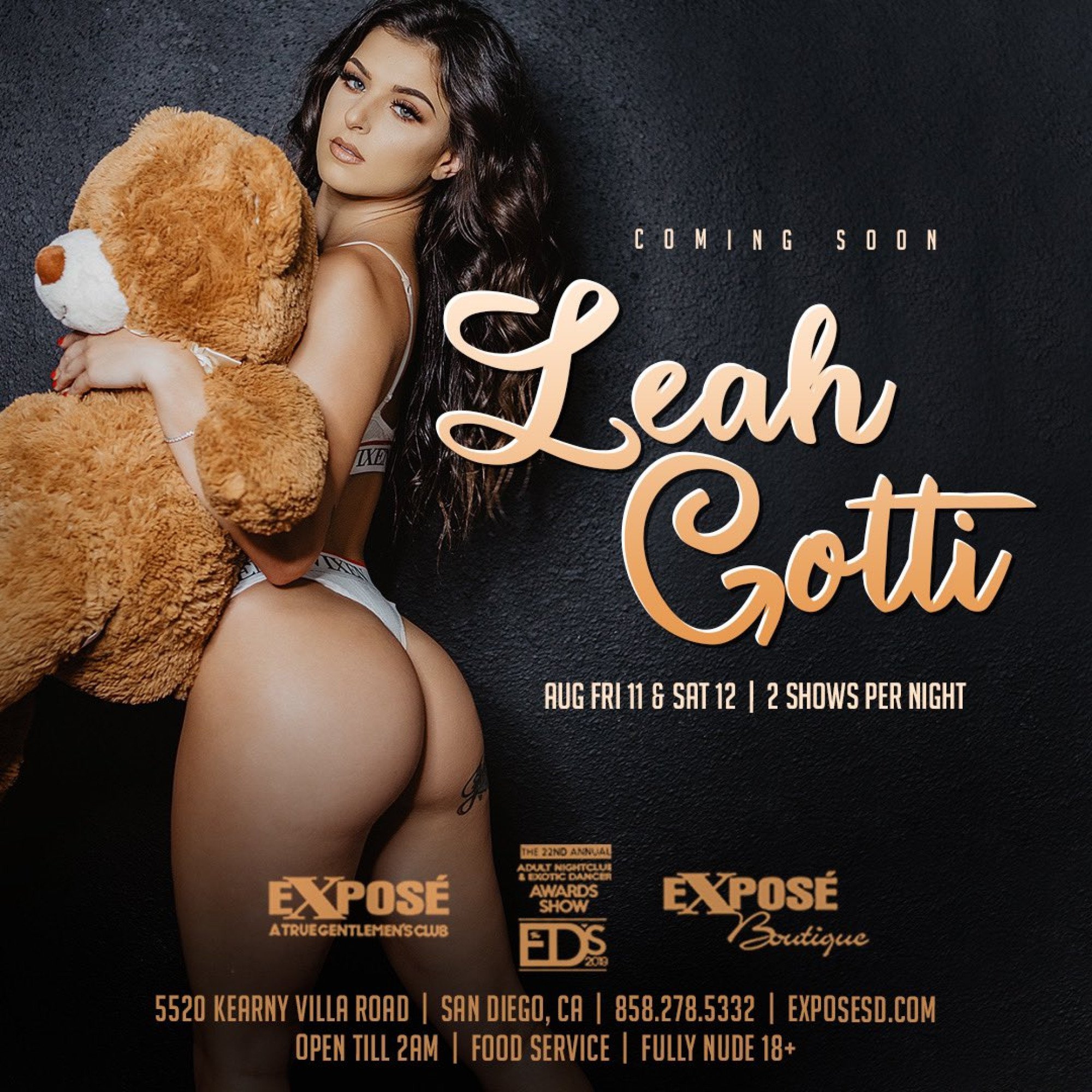 If you're in San Diego during that weekend, consider your plans made. Set your coordinates for Expose, where Gotti will deliver an entrancing striptease performance live! With two shows scheduled each night, attendees are in for a rousing spectacle.