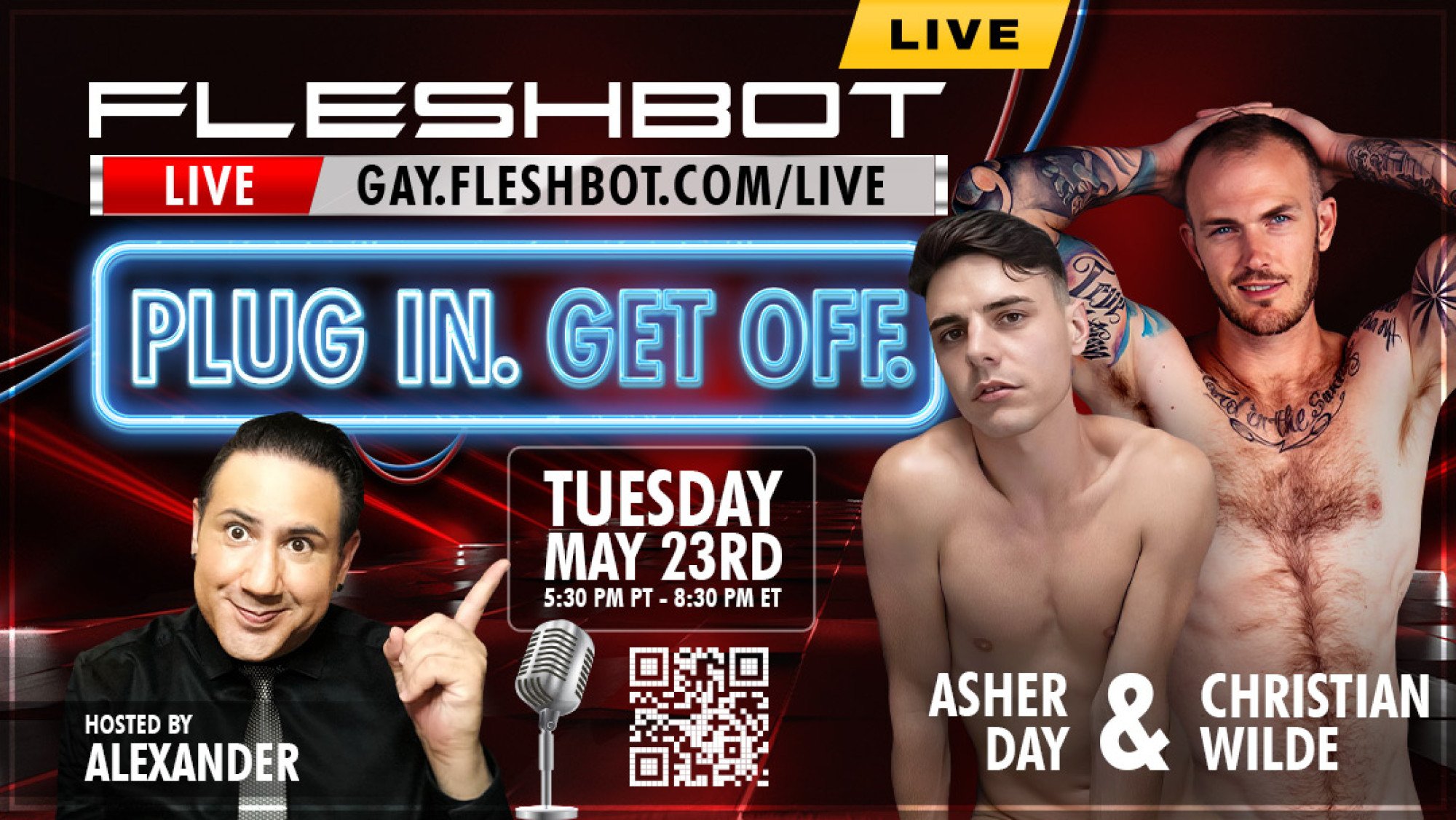 Fleshbot LIVE Powered by Cybersocket is keeping the airwaves hot with its exclusive, monthly chat on their Live Channel featuring a Fan Q&A via chat room and streaming video with Porn Veteran Christian Wilde and Twink Newbie Asher Day on Tuesday, May 23rd at 5:30 pm PT/8:30 pm ET.
