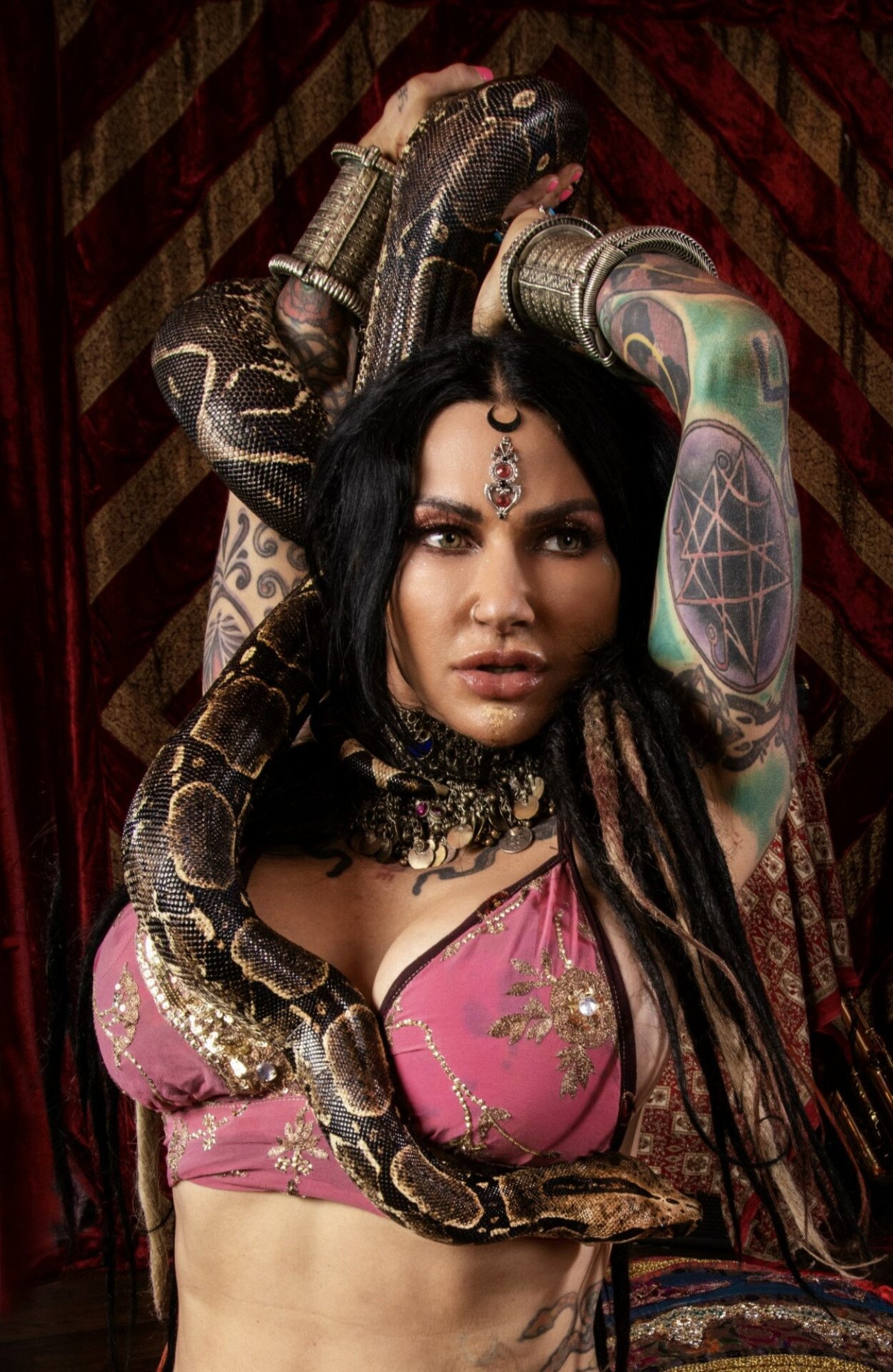 Jenevieve Hexxx is well-known for her love of snakes. The flexible sex goddess performs with her forked-tongue friend Odezza around the world, and she has shared that she has partial reptilian DNA herself, belonging to a hybrid race with otherworldly magical powers.
