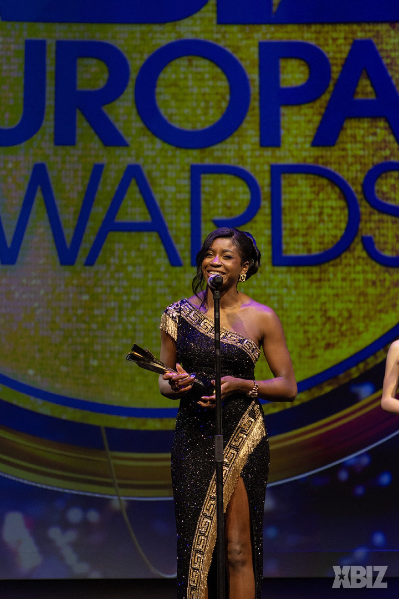 She’s a force to be reckoned with the Best Actor win at the XBIZ Europa Awards for her role as Diana in Lust Cinema’s “The Wedding.” Nicole walked the red carpet and attended the awards show in a dazzling black and gold outfit with serious 1980s vibes.